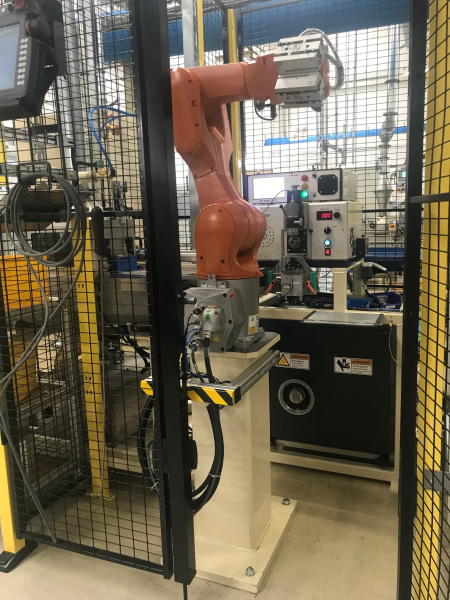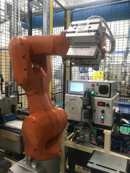 I přes to, že tato linka sice obsahovala automatickou montáž komponentů, nutných pro správnou funkci ložiska, v provádění následných kontrol vyžadovala 100% přítomnost operátora. Ten tuto činnost prováděl manuálně. Po vzoru již zavedené automatizace, kterou jsme v této oblasti před nedávnem ukončili, jsme za montážní stroj doplnili robotické pracoviště KUKA. Toto robotické pracoviště je schopno pomocí kontrolních mechanismů bezpečně provést všechny nadefinované kontroly a vytřídit případné neshodné kusy. Také umožňuje zajišťuje absolutní automatizaci procesu bez nutnosti 100% přítomnosti obsluhy. Celá konstrukce byla opět definována tak, aby operátor mohl ve finále obsluhovat dvě linky samostatně
