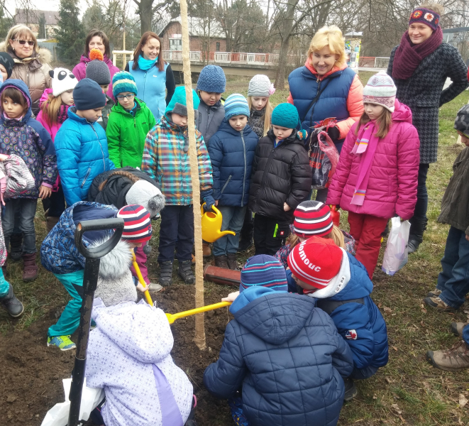 Na děti nejprve čekala přednáška o vlastnostech ukázkového stromu, jímž se stala třešeň ptačí. Tu dostali prvňáčci s lopatkami a konvičkami v rukou. Společnými silami ji zasadili do připravené jámy a na kořeny stále obalené ochrannou tkaninou nadšeně nahrnuli zeminu a ušlapali ji. Zvědavě přihlíželi, jak kolem stromu vyrůstá opora ze surových dřevěných kůlů, a nakonec obsypaly kmen kousky mulčovací kůry, aby čerstvá sazenice neztrácela vláhu. Třešeň do opatrovnictví dostala celá první třída pod vedením paní učitelky Mačkalové, která ji hned opatřila barevnou cedulkou ve tvaru ptáčka.