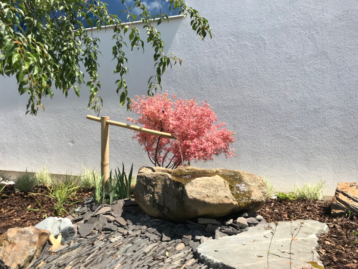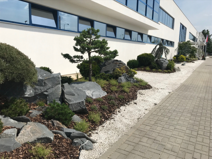 Japonské zahrady slouží jako oázy klidu a meditace, sahají až do animistického náboženství, které přisuzuje duši nejen živým bytostem, ale také neživým předmětům a místům. V Japonsku slouží tyto zahrady jako místo pro odpočinek a relaxaci. Skýtají mnoho významů a opírají se o množství filozofií. Cílem vytvoření této zahrádky na pozemku naší společnosti byla snaha navodit našim zaměstnancům pocit klidu a vytvoření místa pro relaxaci. Japonský styl zahrad nehýří barevnými květy, ale elegantní zelenou barvou. Zelená je barvou přírody, rovnováhy a působí uklidňujícím dojmem.