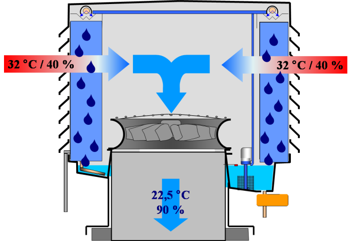 Na vhodném odpařovacím médiu, které je smáčené vodou, je vytvořen relativně velký povrch pro odpařování vody. Skrz médium proudí poměrně malou rychlostí (do 1,5 m/s) venkovní teplý vzduch s nízkou relativní vlhkostí, který absorbuje vodní páru odpařovanou z velkého povrchu navlhčeného média. K odpařování dochází přímo z povrchu média, tento proces je regulován přirozeně a vždy dojde pouze k odpaření takového množství vody, kterou je proudící vzduch schopen přirozeně absorbovat. Zároveň dochází pouze k odpaření samotných molekul vodní páry, přičemž minerály obsažené ve vodě nepřecházejí do chlazeného vzduchu a zůstávají ve vodní vaně pod odpařovacím médiem. Při pravidelné výměně vody dojde jednoduše k jejich vypláchnutí. Adiabatické chladící systémy založení na odpařovacím principu zpravidla nevyžadují žádná další přídavná technická zařízení a pracují s běžnou neupravenou vodovodní vodou.