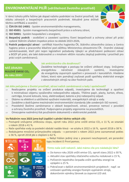 Téma společenské odpovědnosti a udržitelného podnikání (CSR) získává stále více pozornosti napříč světem. Také vedení našeho závodu přijímá CSR jako dobrovolný závazek chovat se zodpovědně k okolnímu prostředí i společnosti. Stanovujeme si etické standardy, minimalizujeme negativní dopady na životní prostředí a pečujeme o dobré vztahy se zaměstnanci. Naše konkrétní aktivity za fiskální rok 2023 naleznete ve Výroční zprávě CSR.